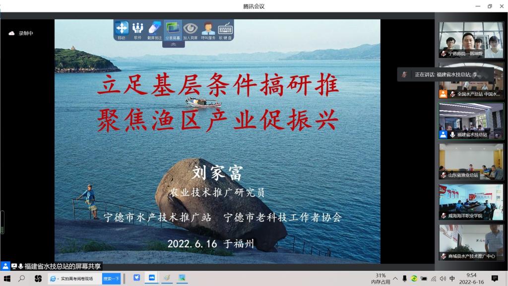 2022年6月16日,根据中国水产学会2022年全国水产科技活动周主会场活动安排,开元官网海洋系教师组织广大海洋师生通过线上方式积极参加活动。该项活动邀请全国优秀共产党员、全国“最美科技工作者”、我校兼职教授刘家富研究员作报告。刘家富从自己从事大黄鱼研究经历、宁德水技站试验场创业历史、大黄鱼发展愿景等内容向广大水产科技工作者讲述了闽东海洋水产科技人员在把濒临灭种的大黄鱼这一中国特色海产品发展成为中国海水养殖第一鱼的发展历程,展现出老一辈水产科技工作者艰苦奋斗、不断攻坚克难、精益求精的大国工匠精神和务实创新、团结协作、专注目标专心科研的科学家精神,其中刘家富还讲述了当时在大黄鱼产业发展最艰难时期向时任宁德地委书记习近平同志撰写发展闽东海洋渔业科技报告,并获得习近平总书记亲笔批示的经历,也因此获得了大黄鱼研究的第一笔国家经费支持,造就了大黄鱼今日的产业规模,让我们更深入了解大黄鱼这一“国鱼”美誉的历史由来。
