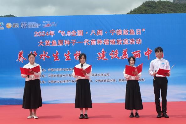 活动仪式上,我校海洋资源开发技术系2023级吴佳怡作为志愿者向社会大众宣读了保护水生生物倡议书,郑诗娴、陈思思、吴培欣等四位同学现场表演《着水墨丹青 绘生态长兴》诗词朗诵,倡导全社会开展科学放流放生活动、了解水生野生动物保护的法律法规,全面参与到水生生物资源养护行动中来,为保护水生生物资源和水域生态环境献出一份力量。
