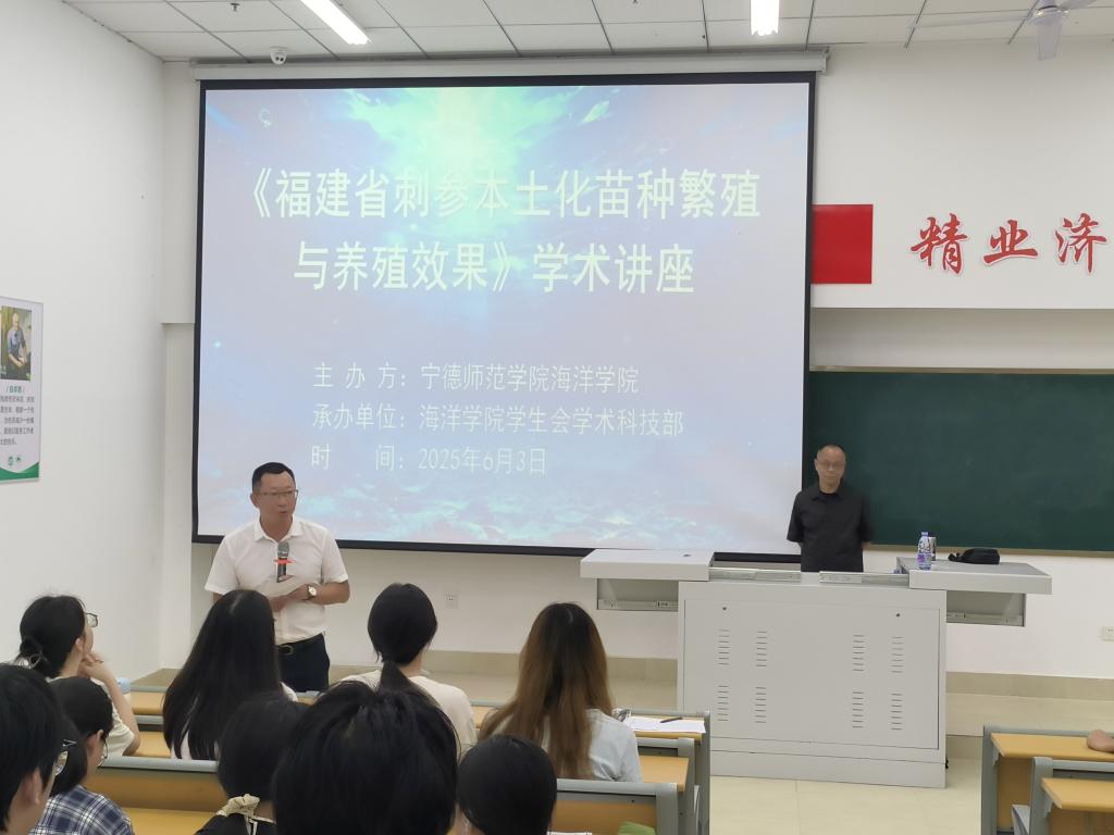 为了推动福建省刺参本土化苗种繁殖与养殖技术的创新发展,助力海洋学科的学术交流与实践探索,2025年6月3日,开元官网在医教楼101成功举办了《福建省刺参本土化苗种繁殖与养殖效果》讲座。此次讲座为师生们提供了一个深入了解刺参养殖前沿技术、交流实践经验的宝贵平台,为福建省刺参养殖产业的高质量发展注入了新的活力。