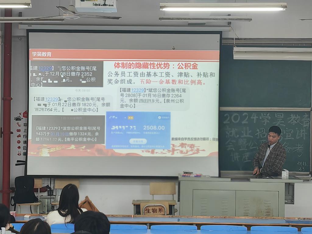 宣讲会伊始,主讲人雷老师先向同学们整体介绍了学昊教育的组成体系,让同学们对学昊教育有了一定的了解。而后对公职类岗位进行全面的分析,剖析了国考、省考、选调、国企与事业单位等考试。接着再延伸至各岗位工作的薪资待遇与发展前景,其中,公务员的工资由基本工资、津贴、补贴和奖金组成,五险一金基数与比例高,而公积金则是体制的隐藏优势。最后为同学们详细介绍了备考方法,从备考时间到备考内容都包括在内。