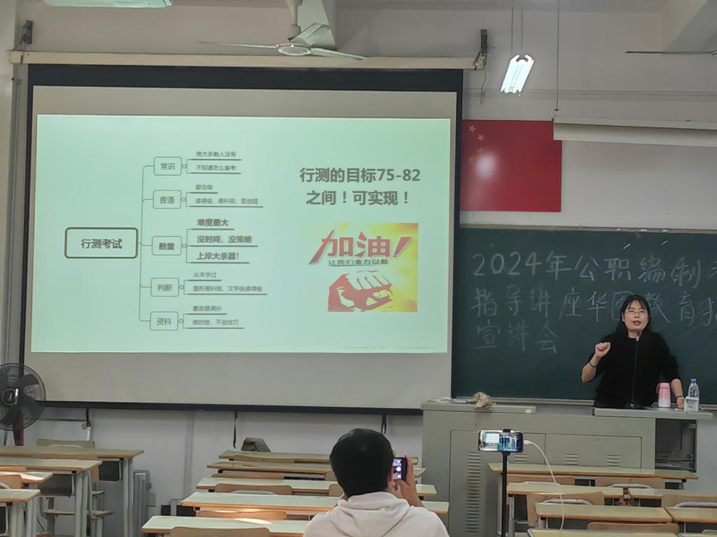 招聘会伊始,华图教育招聘人员谢惠玲以讲述自身的经历为开头,简要介绍关于公职编制考试的相关内容,让与会同学对华图教育有了初步的了解。紧接着,她从分析考研留学、创业就业等方面的利与弊,帮助大家选择自己未来的道路。同时,谢惠玲着重分析了应届生考公的优势和当前的就业形势。最后,华图教育蓝校长讲解了今年华图教育的招聘岗位,并介绍华图教育的发展经历及其优势,鼓励开元官网学生来到华图教育的工作岗位。