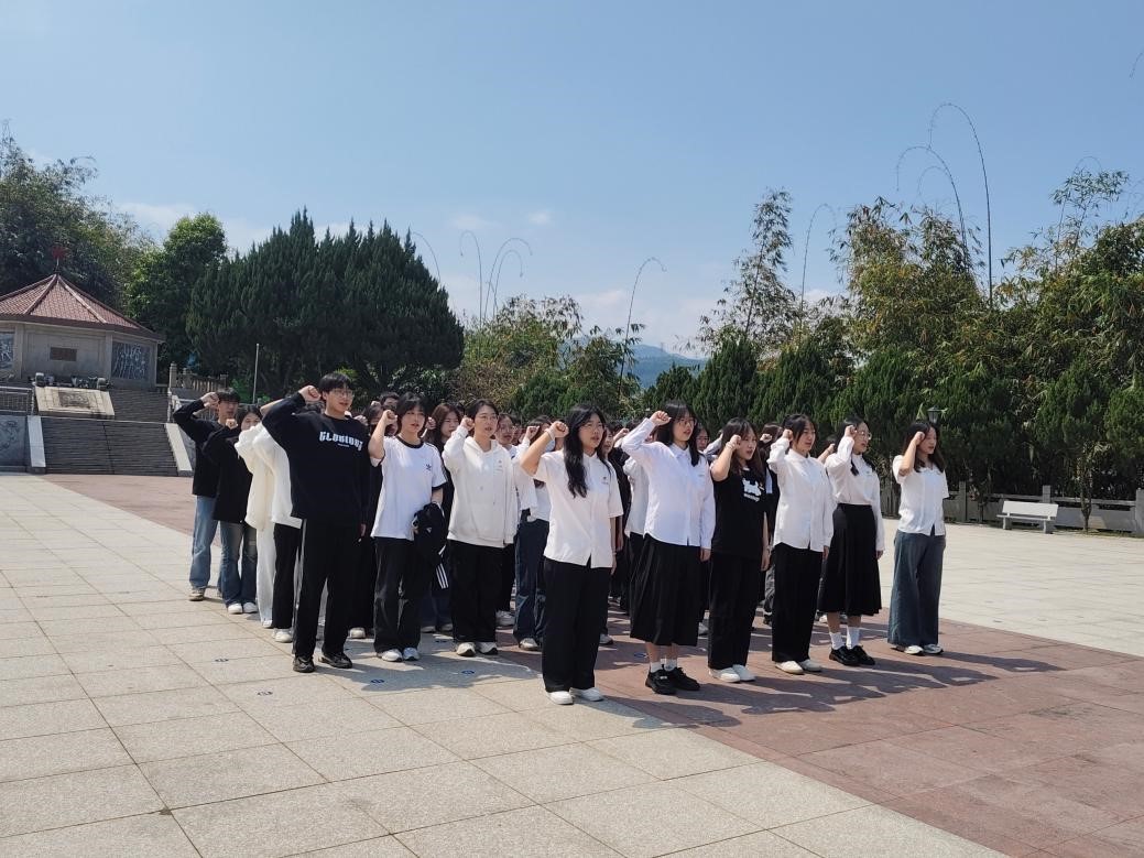 下午两点,同学们怀着崇敬的心情,自行组队前往蕉城区革命烈士陵园参与本次祭扫活动。活动伊始,全体成员在烈士纪念碑前默哀一分钟,并进行了庄严宣誓:“人民为先,祖国至上;诚实勇敢,自律自强;奋发有为,誓做栋梁;振兴中华,再造辉煌。” 宣誓声回荡在烈士陵园上空,铿锵有力的誓言不仅是承诺,更是新时代青年对历史的回应。在庄严的宣誓结束后,同学们缓步走向革命烈士纪念碑敬献花束,向先烈们致以最崇高的敬意,追思他们为国家和人民所做出的巨大牺牲和不朽功绩。一束束白菊与黄菊在阳光下静静绽放,象征着革命精神永续传承,也寄托着青年一代对英雄的无限追思。宣誓和献花结束后,同学们便自行在烈士陵园中进行参观,从历史文物与英雄故事中感悟到了革命精神,更加深刻地体会到今天幸福生活的来之不易。