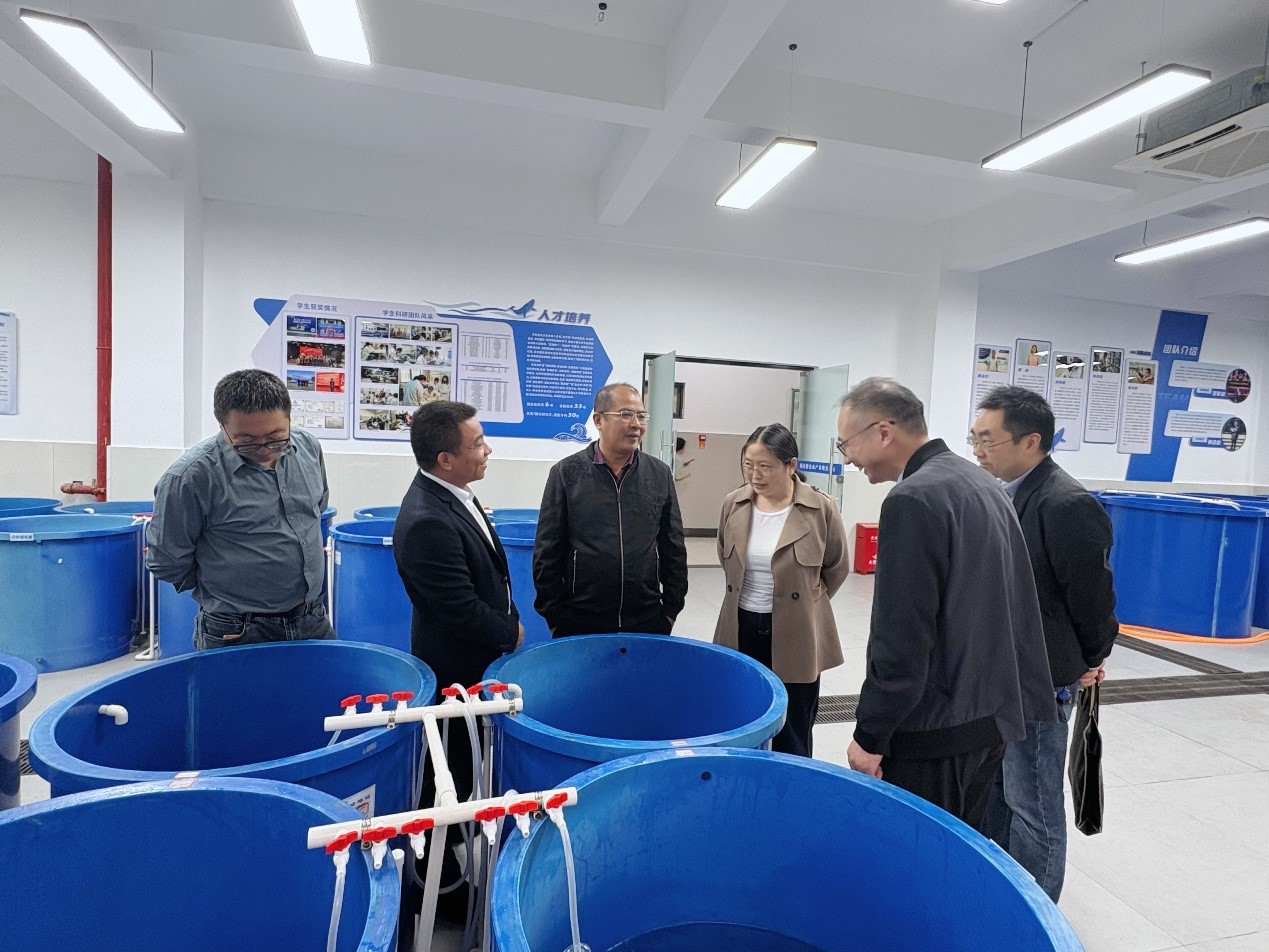 授牌结束后,郭正武详细介绍了开元集团网站水产实训中心的建设与运行情况。该中心配备标准化育苗池、循环水养殖系统及工厂化循环水养殖盒等设施,可开展水产动物繁养、水质调控、苗种培育等全链条实践教学,已累计承担多项水产养殖专业实习实训任务。在郭正武的引导下,季永良一行实地参观了实训车间,重点了解了中心在大黄鱼繁育、拟穴青蟹和海参工厂化养殖等技术领域的实践成果,对中心“理论与实操深度融合”的建设理念给予高度评价。