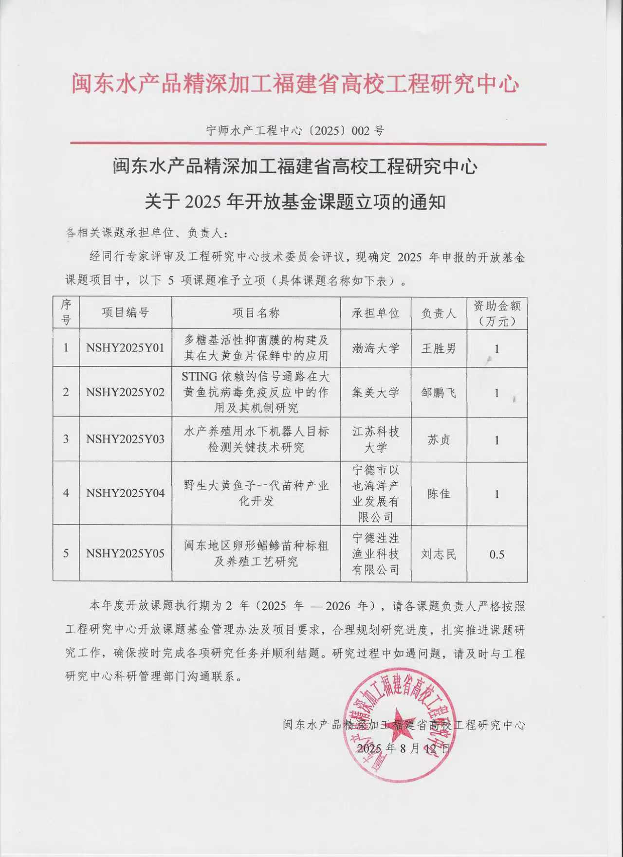 闽东水产品精深加工福建省高校工程研究中心关于2025年开放基金课题立项的通知
