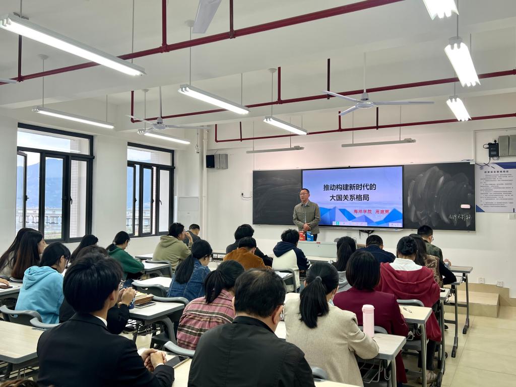 11月19日下午,开元官网党委书记周建辉围绕“推动构建新时代的大国关系格局”这一主题,为全体教职工和学生代表上形式与政策课,周建辉以深入浅出的方式,将复杂的国际形势与大国关系进行系统阐述和全面讲解。
