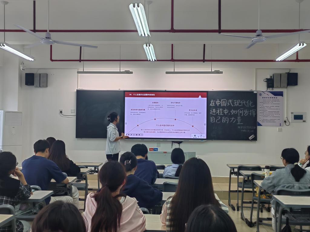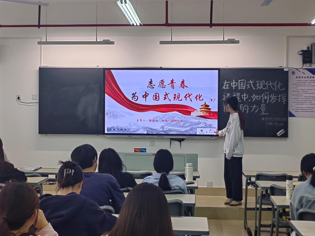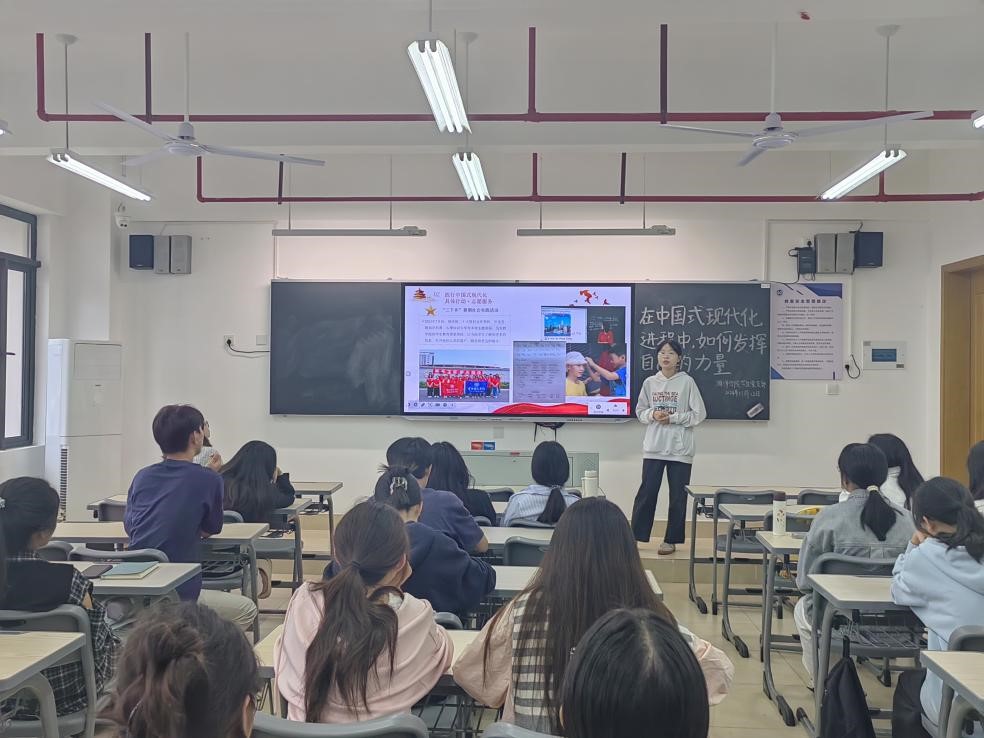 分享会上,张慧萍、、吴艺华、何丽贞、叶巧辉、高逸萱六位同学依次上台从对中国式现代化的理解、践行中国式现代化的具体行动以及青年们该如何做三方面的内容展开分享。其中,张慧萍立足学生干部经历,分享自己从被动接受任务到主动思考为为班级建设出谋划策的想法转变,激励与会青年积极适应和参与中国式现代化的进程,为实现国家的长远发展目标贡献自己的力量;郭湉湉以志愿青春为中国式现代化发挥自身力量为分享内容,讲述了在飞鸾镇中心小学的支教故事,鼓舞在座青年积极参与社会实践志愿服务,创新志愿服务形式,助力中国式现代化建设;吴艺华通过分享自己暑假助教的经历,领悟“用心做教育,用爱暖童心”的责任担当。她说,以挺膺“青春之姿”,奔赴“新征程”是她本次分享会主题的回答。