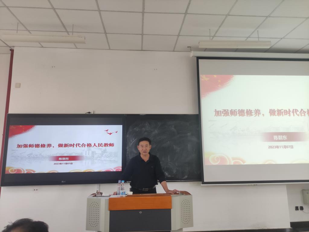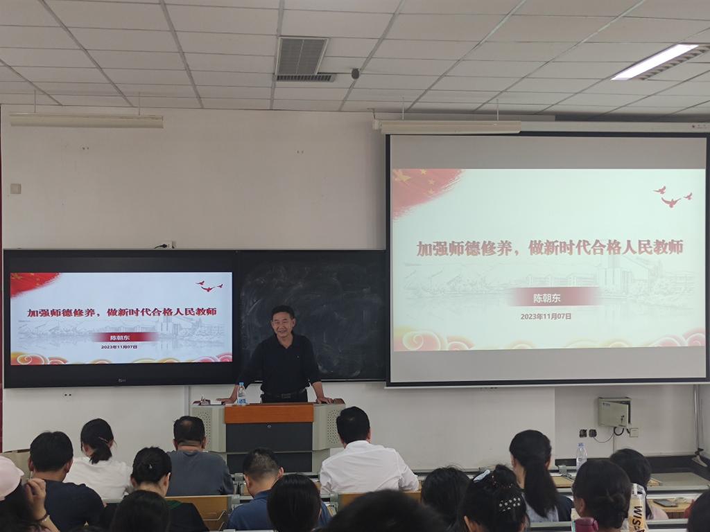 随后,陈朝东从“三爱、两仁、一终生”概括了教师职业道德的6个方面,提醒与会教师和师范生,要以教师行为准则约束自身行为,提高认识,认真学习和弘扬孔子、陶行知等优秀教育家精神,为教育事业发展作出贡献。最后,他从习近平总书记给广大教师的寄语中回答了在新的征程,要如果做一名合格的人民教师。他号召与会人员要始终坚持为党育人、为国育才的初心使命,以“四有”好老师的标准,做学生成长路上的“四个引路人”,以“躬耕教坛,强国有我”的志向和抱负,为强国建设,民族复兴贡献力量。